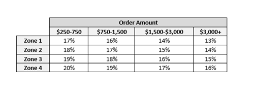 The more you order, the better your freight rate. Here's a look at how the new freight percentages will be structured:
