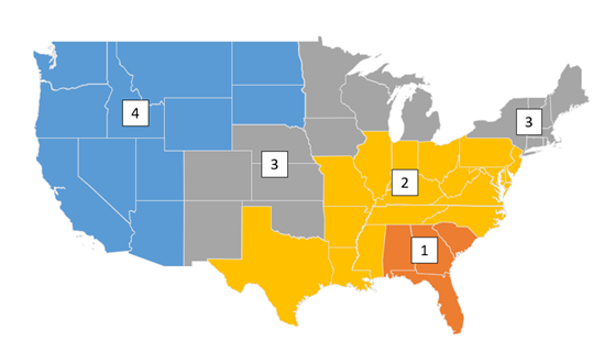 Delivery locations will be organized into four different zones, and each of those zones’ freight costs will vary. These zones were created based on the distance from Mud Pie’s distribution center, delivery times, and regional costs. A zone chart is shown below so you can see where your store falls.