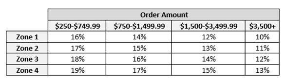 The more you order, the better your freight rate. Here's a look at how the new freight percentages will be structured: