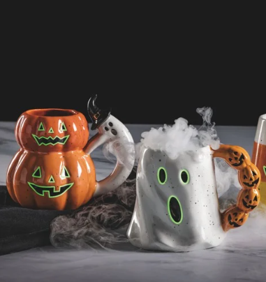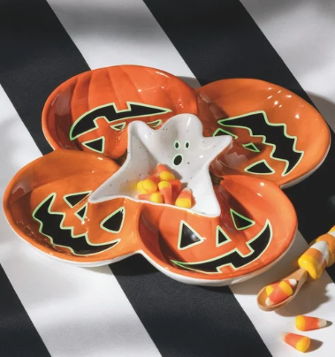 Make gifting easy by displaying Halloween bowls, platters, jars, and towels with wrapped candy to inspire quick, grab-and-go hostess gifts.