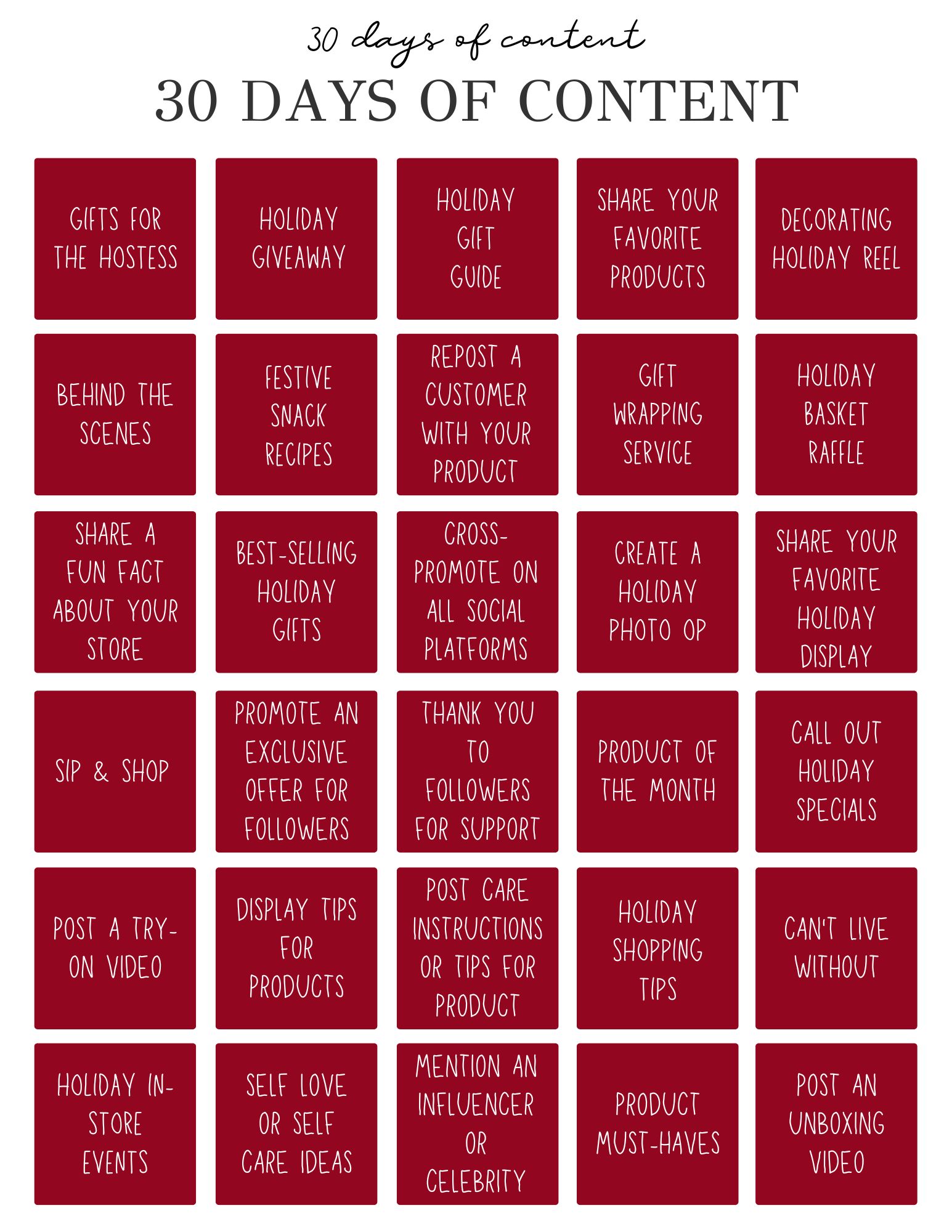 Stay organized with a social media calendar! Print off this calendar and start planning your content through Q4. We’ve gone ahead and included holidays and popular social media dates; now it’s time for you to plug in ideas and happenings relevant to your store!